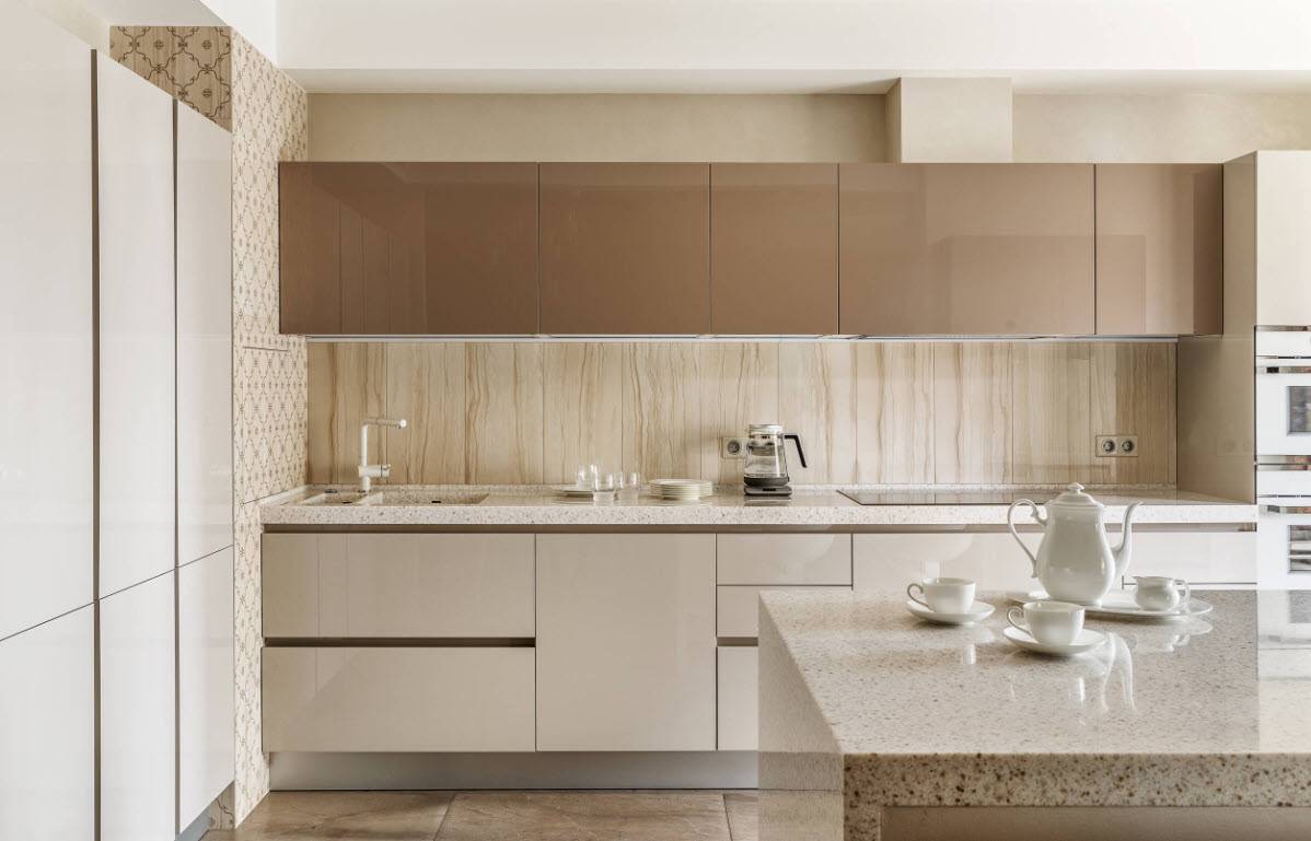 В таких моделях практически никогда не бывает стеклянных фасадов и открытых полок. Что касается формы, самыми распространенными стали гарнитуры в стиле минимализм в форме буквы «П» и «Г» либо в виде прямой линии.