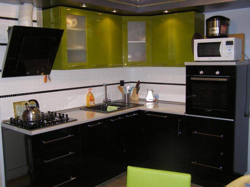 - Выбирая конструкцию мебельного гарнитура, сразу исключаем островные и П-образные варианты. Они занимают много места. Самая подходящая форма – линейная. Если нет возможности выстроить все в одну линию, используем Г-образный вариант, он также компактен.