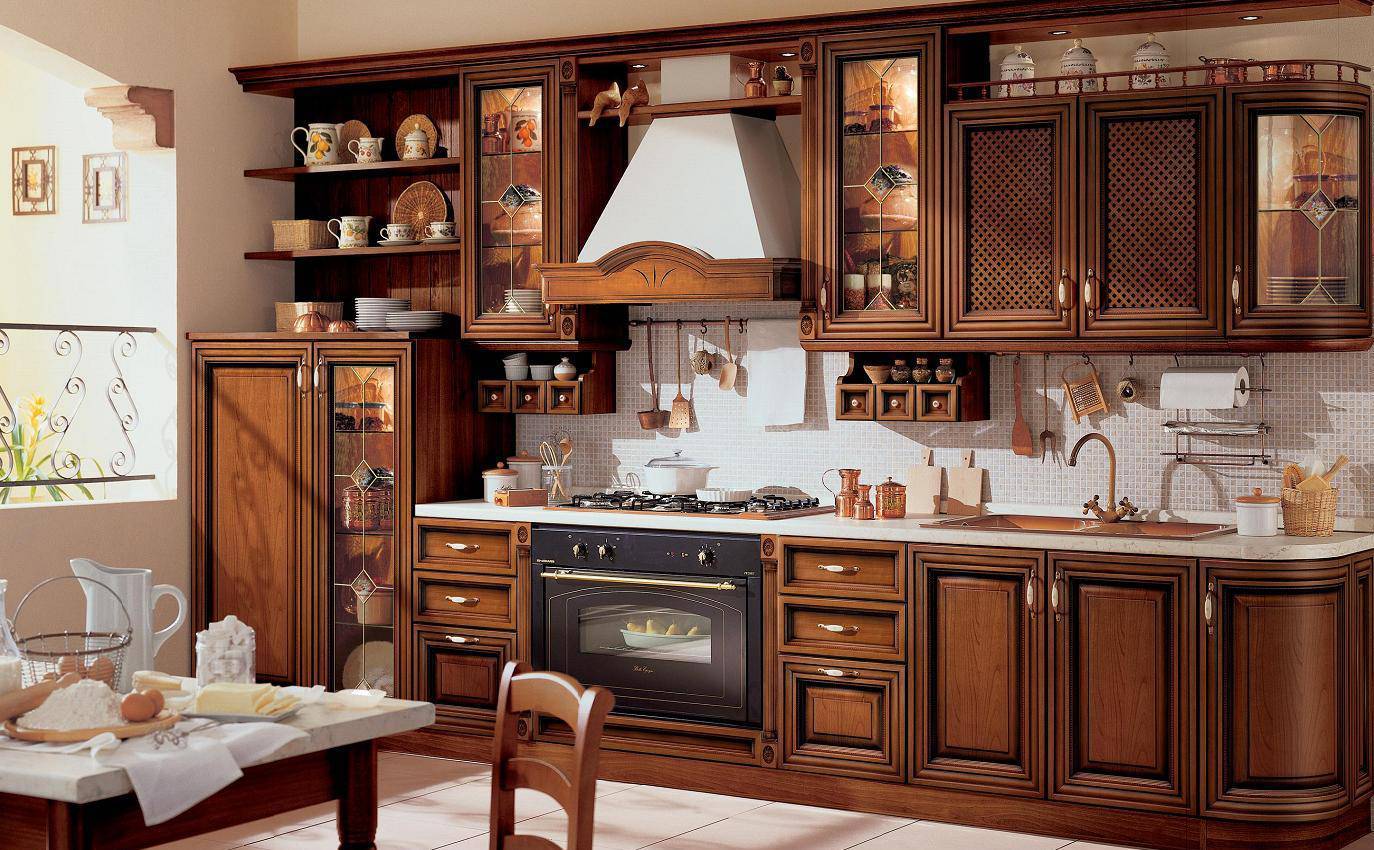 - Простые и грубые деревянные материалы кухонного гарнитура с резными деталями на фасадах. Особенно актуальна массивная дубовая мебель с большим деревянным обеденным столом.
