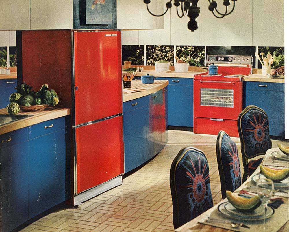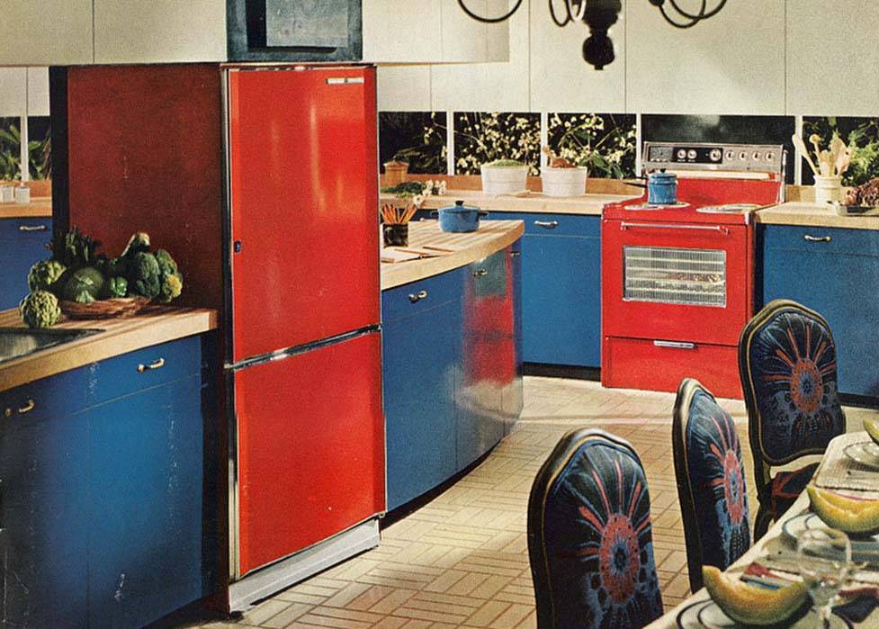 Бытовая техника прошедшей эпохи отличается плавными линиями, обтекаемыми формами. Классический пример – «пузатый» холодильник. Часто приборы, например, духовые шкафы укомплектованы длинными ручками-скобами. Если имеются окошки, то углы их скруглены. Агрегаты внешне производят впечатление массивных и тяжелых, они могут быть выкрашены в желтый, голубой, зеленый, красный, розовый или другой яркий цвет.