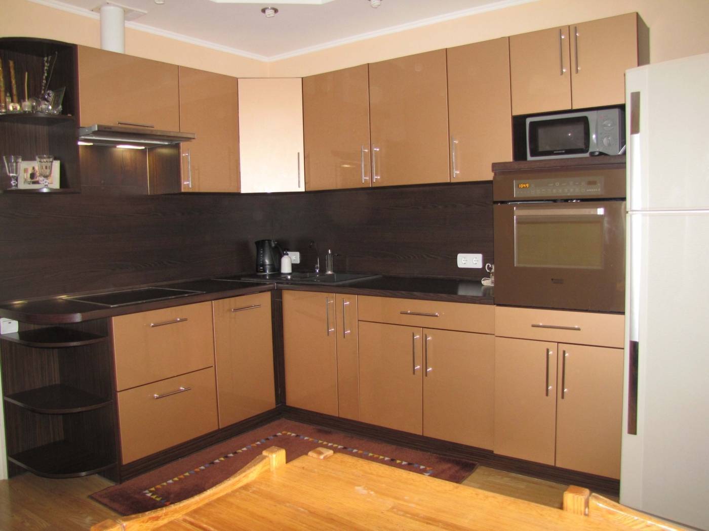 Пластиковые кухни в коричневом цвете будут красиво смотреться с белыми, бежевыми, оранжевыми, салатовыми стенами. Очень много производителей, работающих с коричневым цветом, предлагают комбинировать коричневый цвет нижних шкафов с, например, бежевыми/оранжевыми/салатовыми или белыми верхними шкафами.