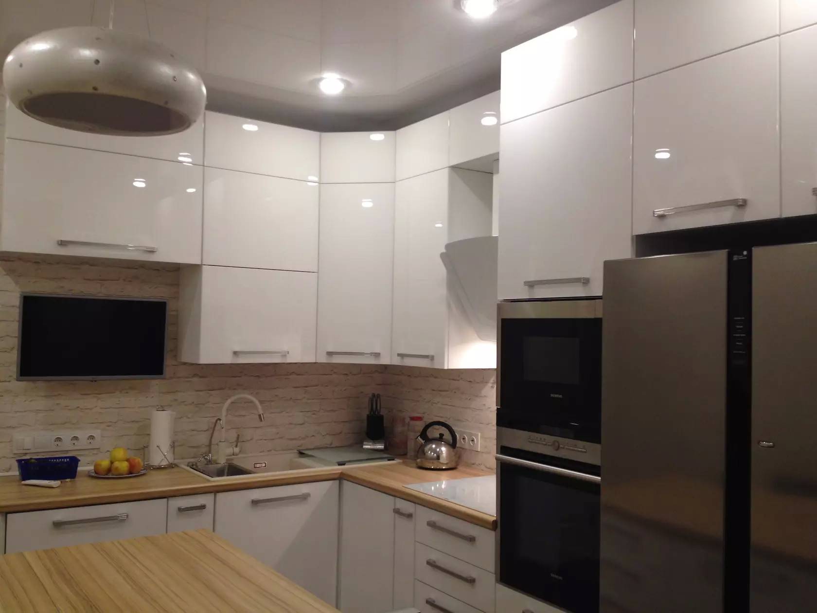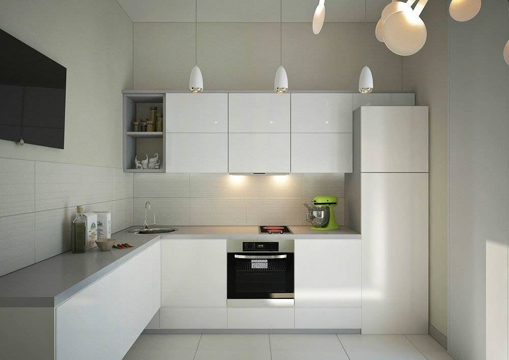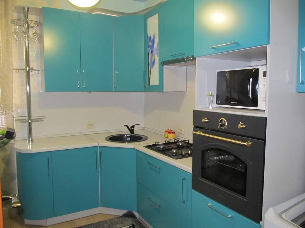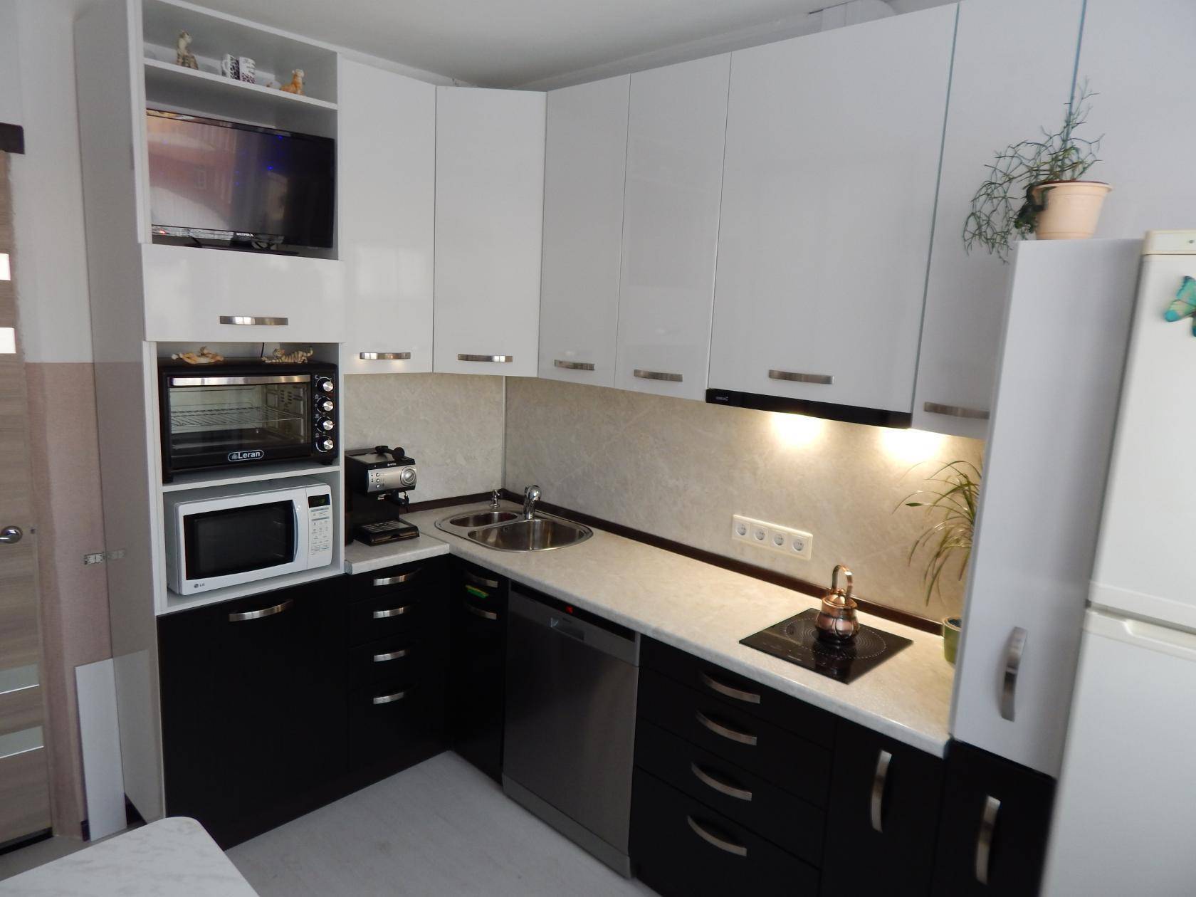 - Г-образная расстановка. Угловые пластиковые кухни будут очень вместительными, это видно на фото. Сделают маленькое пространство более функциональным.