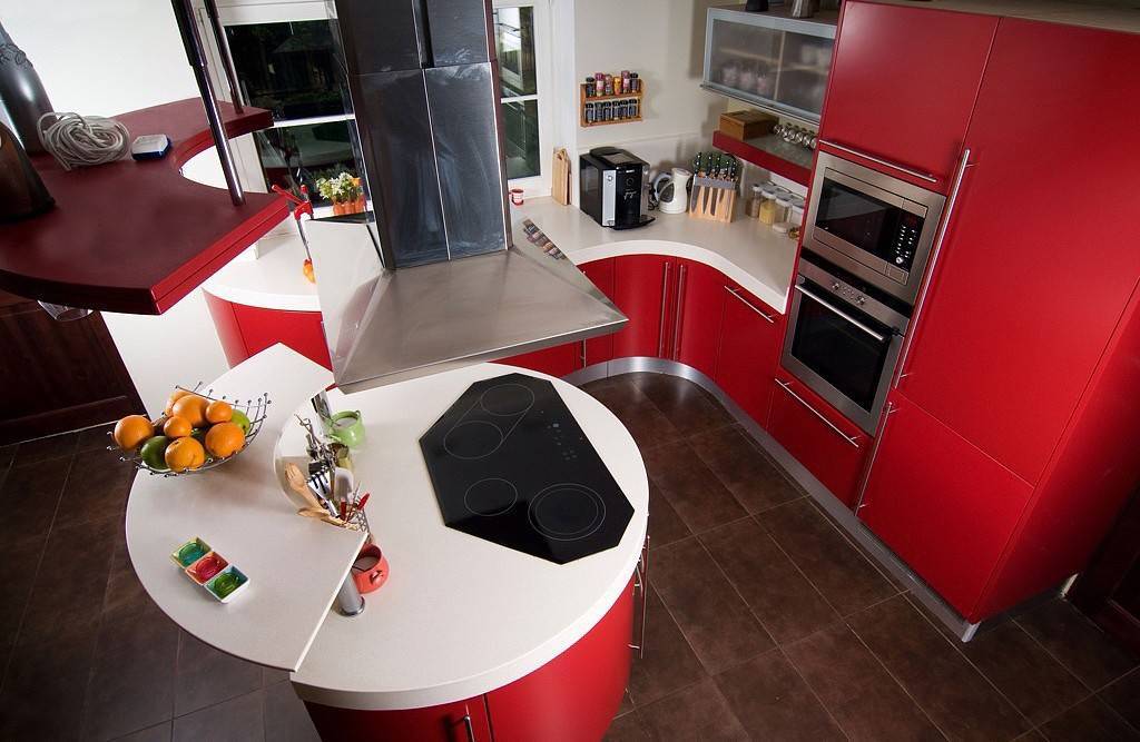 Но к мебели такого цвета будет сложнее подобрать хорошо сочетающийся фартук и напольное покрытие. Дизайнеры, сталкиваясь с таким цветовым предпочтением заказчика, обычно вынуждены предлагать для комбинации лишь три цвета – белый, серый, черный. Другие цвета, применяемые в интерьере, будут отвлекать от насыщенного красного цвета кухонной мебели.
