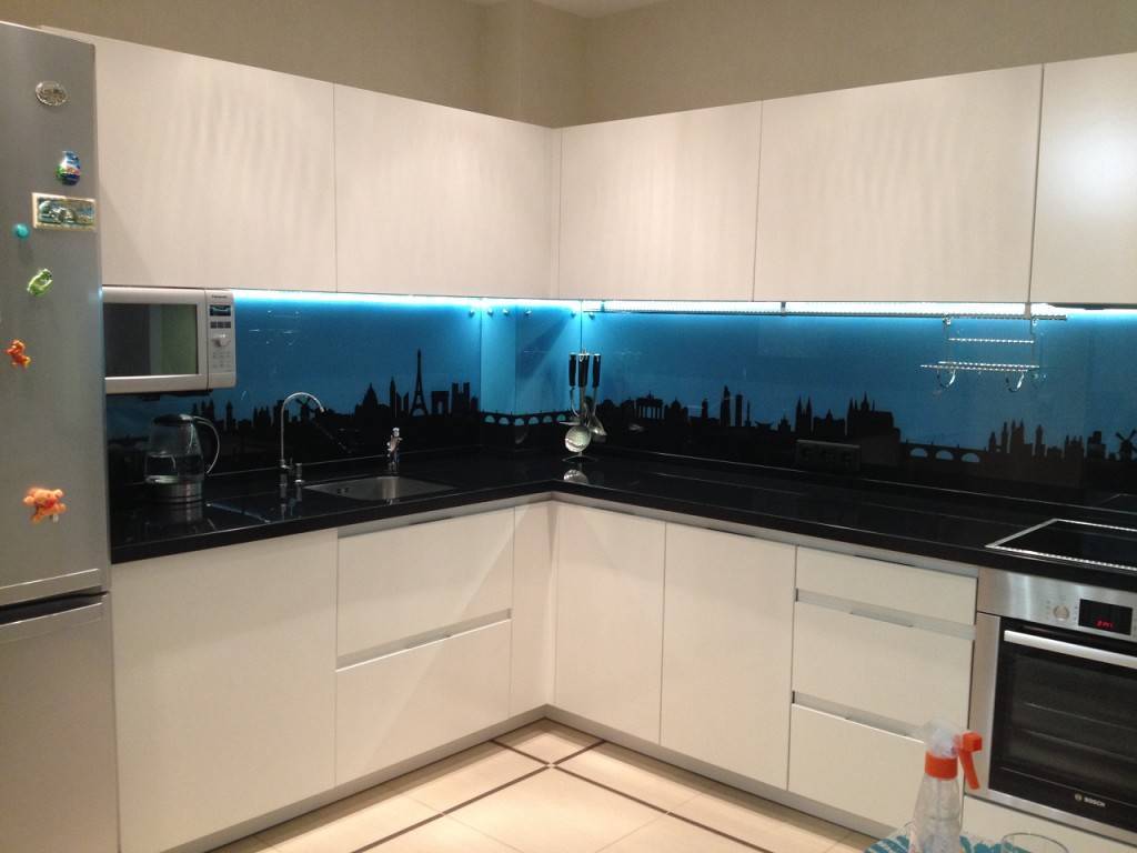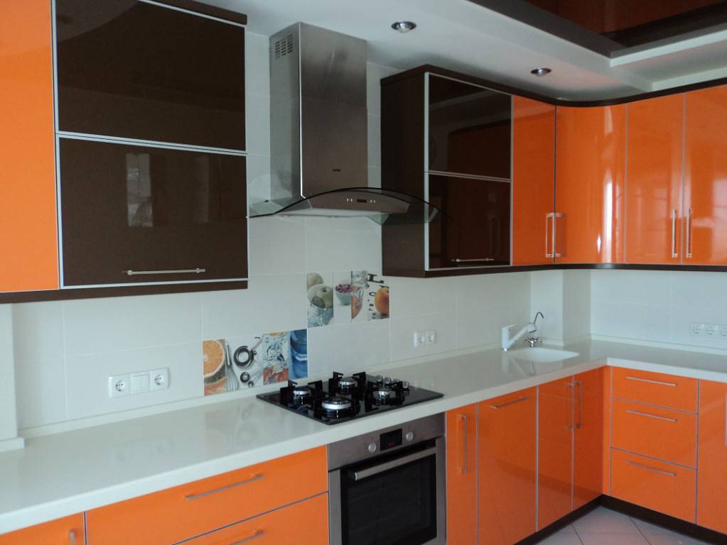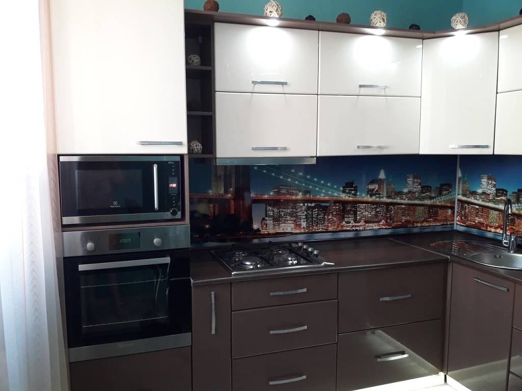 Фартук в таких кухнях может быть представлен в третьем цвете, например, в сером, оранжевом или красном. Такой вариант мебели выбирают те, кто хочет оформить свою комнату для приема пищи в неоклассическом стиле, в стилях модерн или хай-тек.