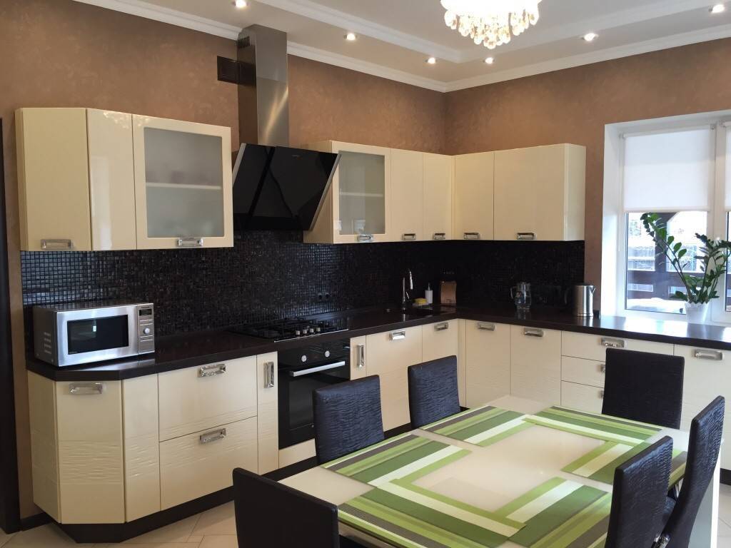 Также считается универсальным бежевый цвет, который дарит помещению тот же праздничный эффект, что и белый цвет. Кухня из бежевого пластика красиво смотрится на фоне темных стен и темного фартука.