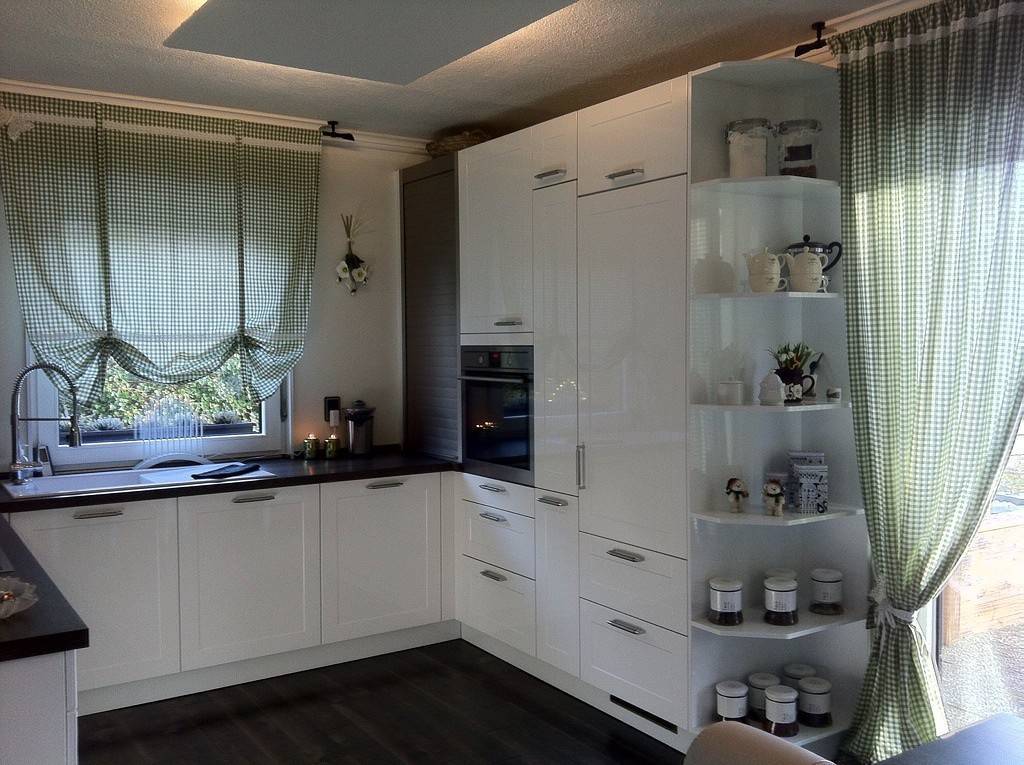 Домашний текстиль делает комнату более уютной, обжитой, а на кухне без него вообще трудно обойтись. Как минимум понадобятся полотенца и занавески. Шторы на маленькой кухне дополнят цвета фасадов, пола или стульев, скроют все происходящее от посторонних взглядов и защитят от яркого света.