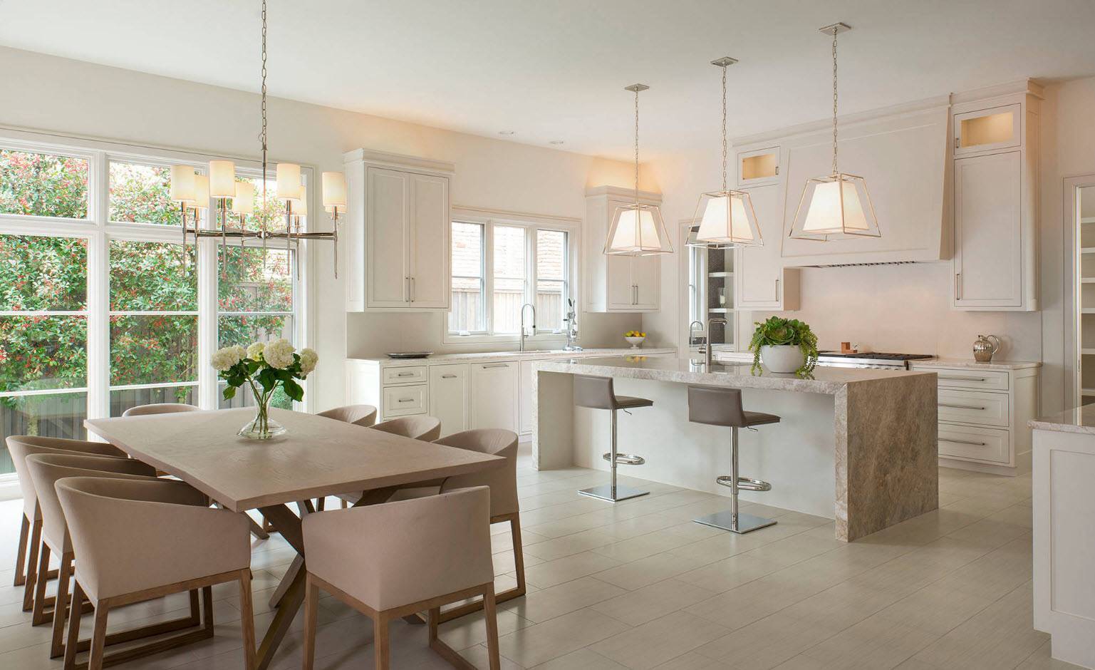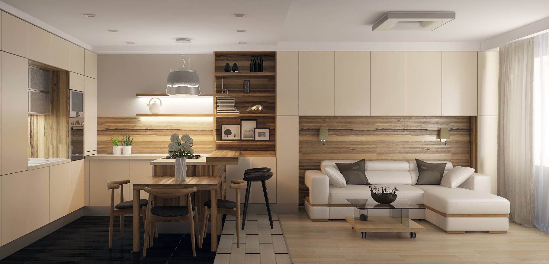 Как оформить пространство в одном стиле, но при этом грамотно выделить основные функциональные зоны? Здесь важно исходить как из собственных потребностей, так и из возможностей помещения. Например, для небольшой семьи, которая собирается вместе только за ужином, скорее всего не нужна большая кухня