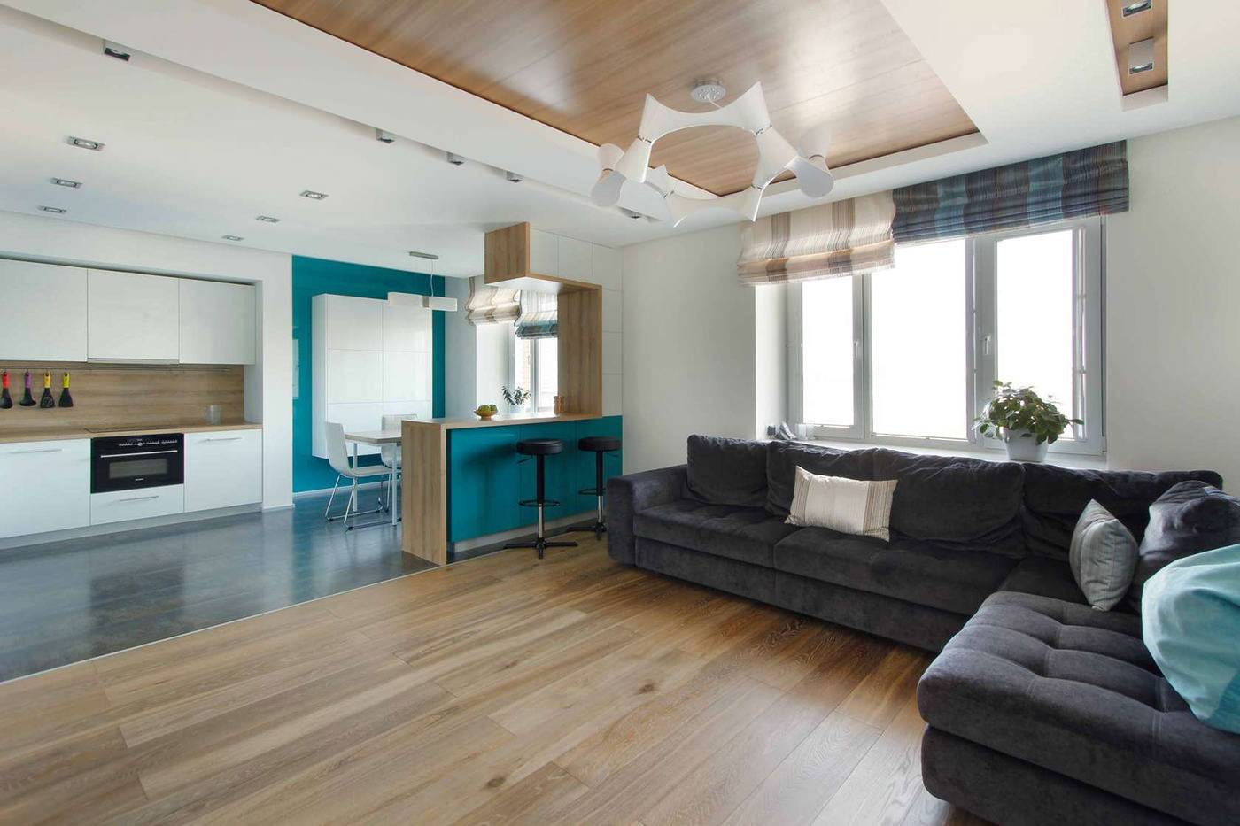 Присмотритесь внимательно к этому варианту, если у вас уже есть какая-либо граница (реальная или визуальная) между кухней и гостиной – барная стойка, перегородка, фальш-стена.