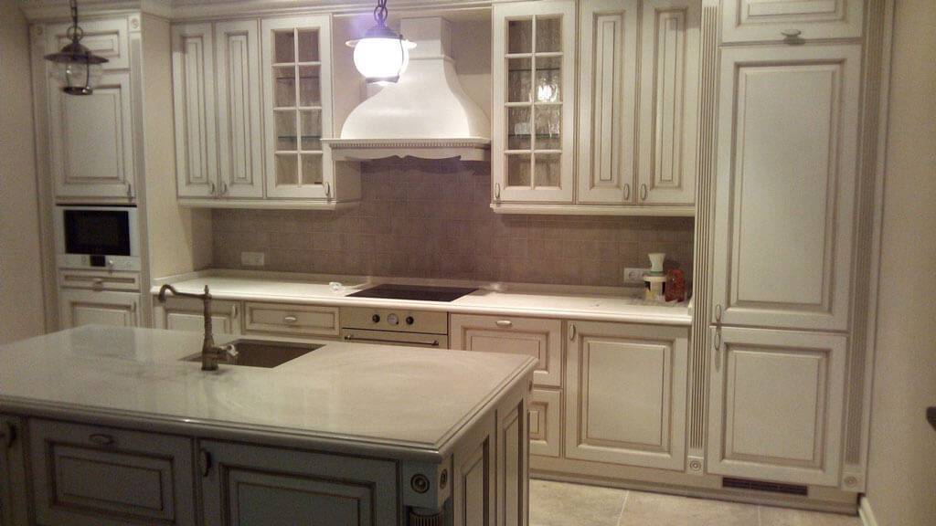 Подобные тона прекрасно подходят для классики, прованса, с ними сочетается патина любого цвета. Чтобы кухня оставалась нежной и светлой, стоит выполнять патинирование не слишком темными тонами: серым, голубым, зеленоватым, лиловым, золотистым.