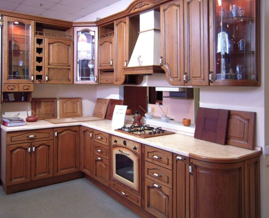Фасады могут выполняться как из натурального дерева, так и из МДФ. Первые считаются более качественными и долговечными, а вторые — бюджетными. В последнее время стали популярны комбинированные фасады: их рамка выполняется из массива, а вставка — из МДФ или стекла.