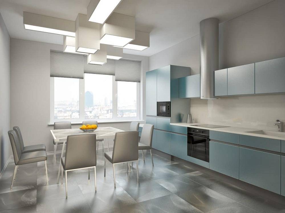 Оформление кухни в стиле минимализм предполагает подбор индивидуального светового решения для каждой функциональной зоны: верхней или общей, а также рабочей и обеденной.