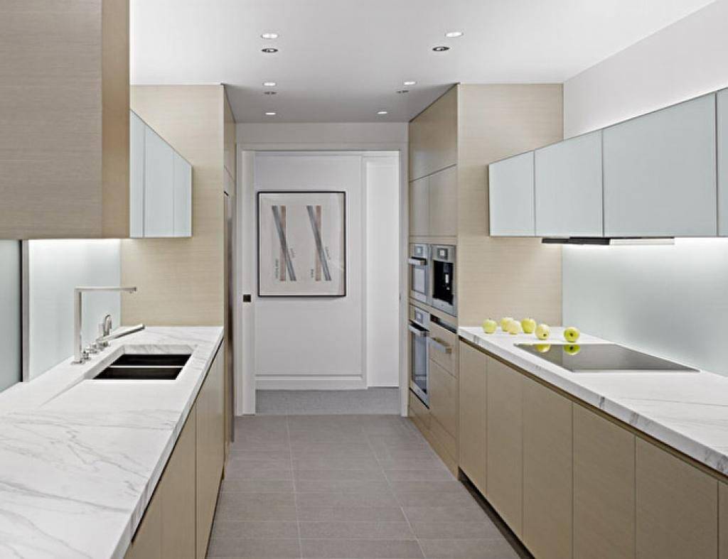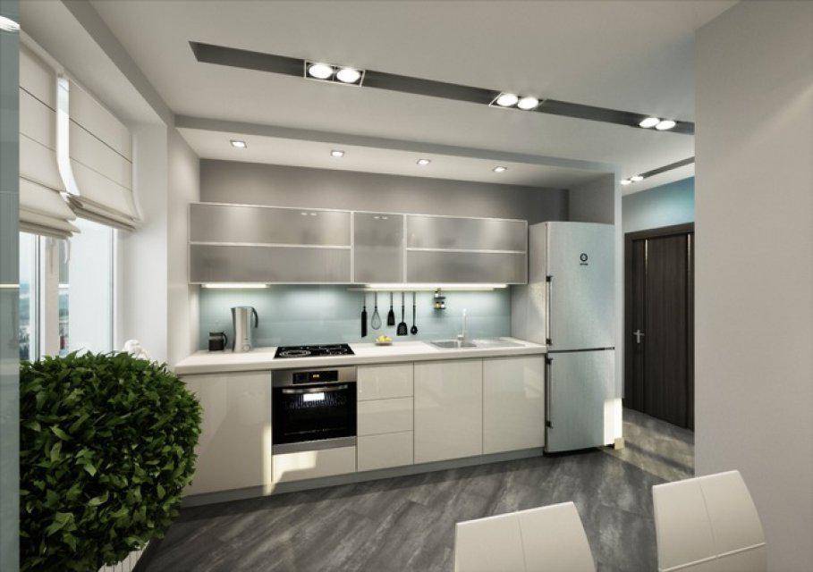 Все используемые элементы должны иметь простую декоративную отделку и быть малозаметными. Для этой цели отлично подойдет светодиодная лента, скрытая под нижней частью навесных шкафов. Точечные светильники, встроенные в многоуровневые потолки, также гармонично впишутся в минималистический интерьер.