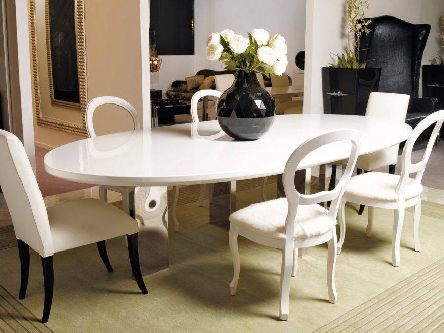 В просторных комнатах проще подчеркнуть изящные формы стола или сделать его главным акцентом. Овальные столешницы эргономичны и хорошо вписываются в помещения стандартных размеров, узкие или просторные комнаты.