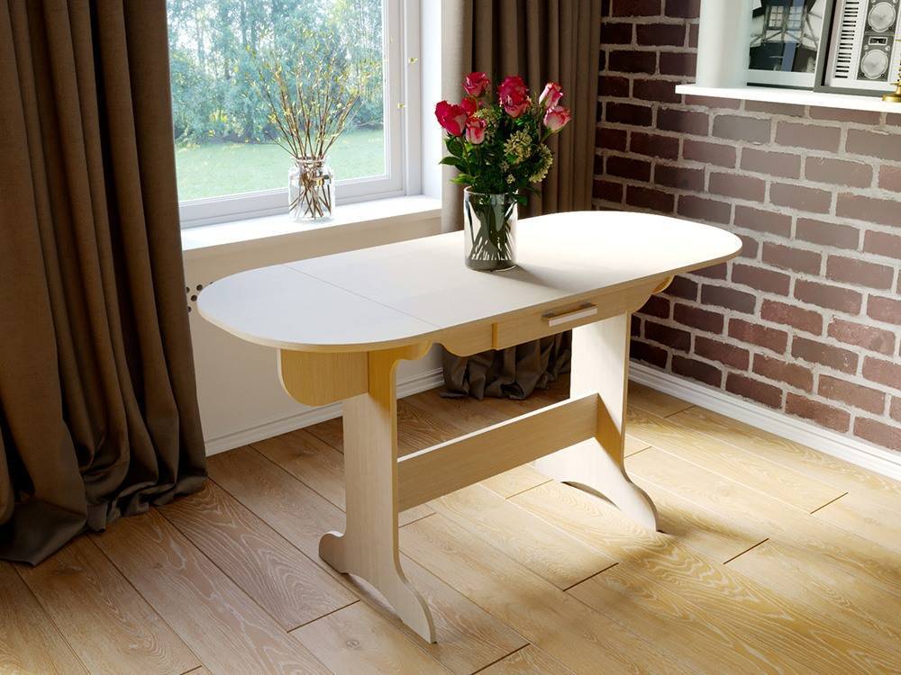 - в сложенном виде предмет служит обычным кухонным столиком, за которым удобно обедать в одиночестве. Но стоит появится гостям или праздничному поводу – и он моментально превращается в полноценный большой овальный стол для торжественных мероприятий.