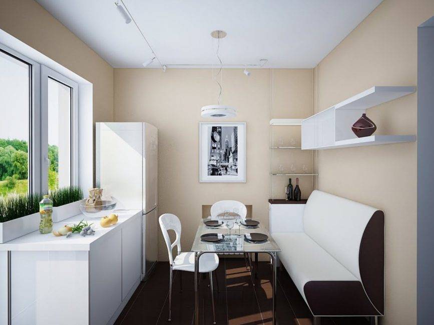 Удобным вариантом для небольшой кухни станет многофункциональный диван. Желательно лаконичного размера и формы.