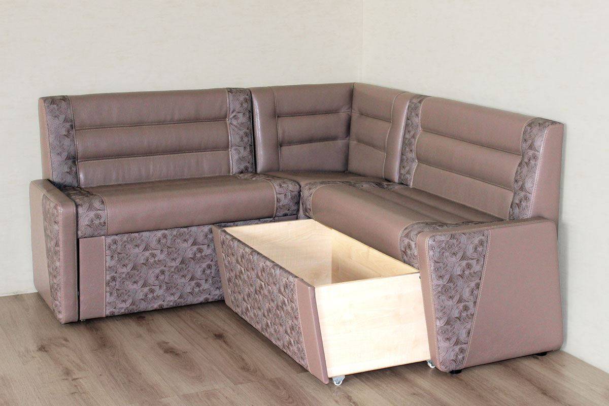 - имеется свободное пространство внутри диванчика, которое представляется нишами, выдвижными ящиками; в них можно спрятать габаритные полезные вещи, которые редко используются на кухне.