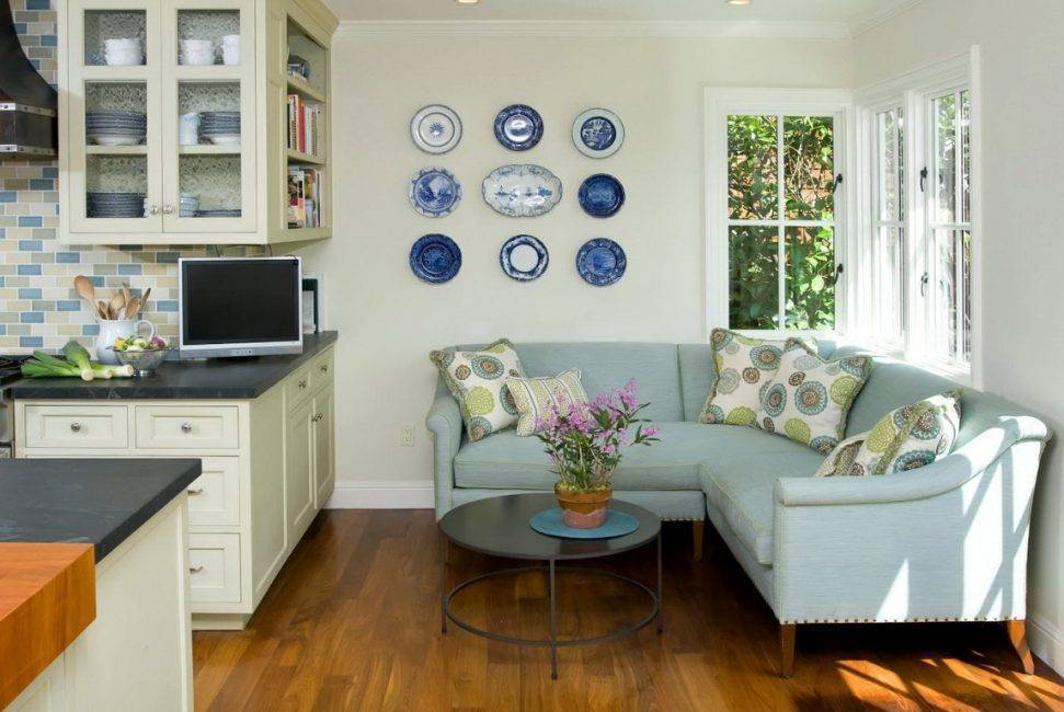 Если в просторном помещении элементарно разместить габаритный мягкий уголок с кожаной обивкой или островной диванный массив в форме П, то в миниатюрной комнате каждый м² на счету. Чтобы не перегрузить интерьер маленькой кухни с диваном, нужно применить все возможные способы визуального расширения пространства: