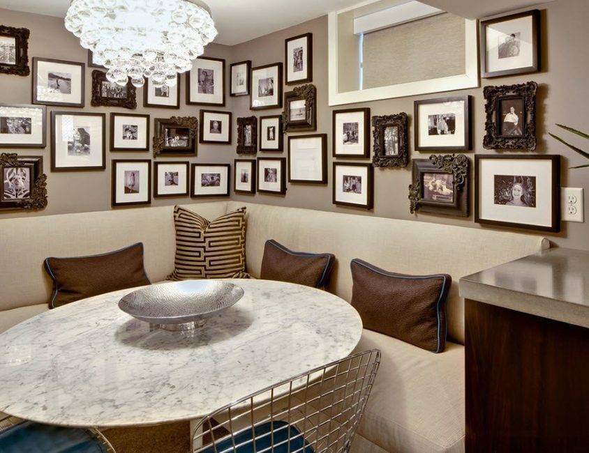 К нему, а также квадратному, можно подобрать аккуратный диван прямоугольной формы. Также сюда подойдет угловой и квадратный. Размер предметов мебели должен хорошо сочетаться между собой. Только при соблюдении этого условия комплект с диваном будет выглядеть в кухне достойно.