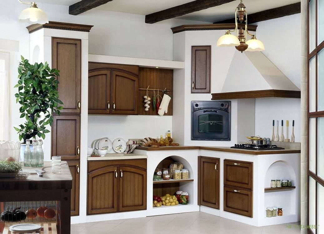 Классический. В нем преобладают простые формы, пастельные тона, естественные текстуры. Часто оборудование встроено, прикрыто деревянными фасадами в едином мотиве. Возможно украшение резьбой, вставками с позолотой и серебром.