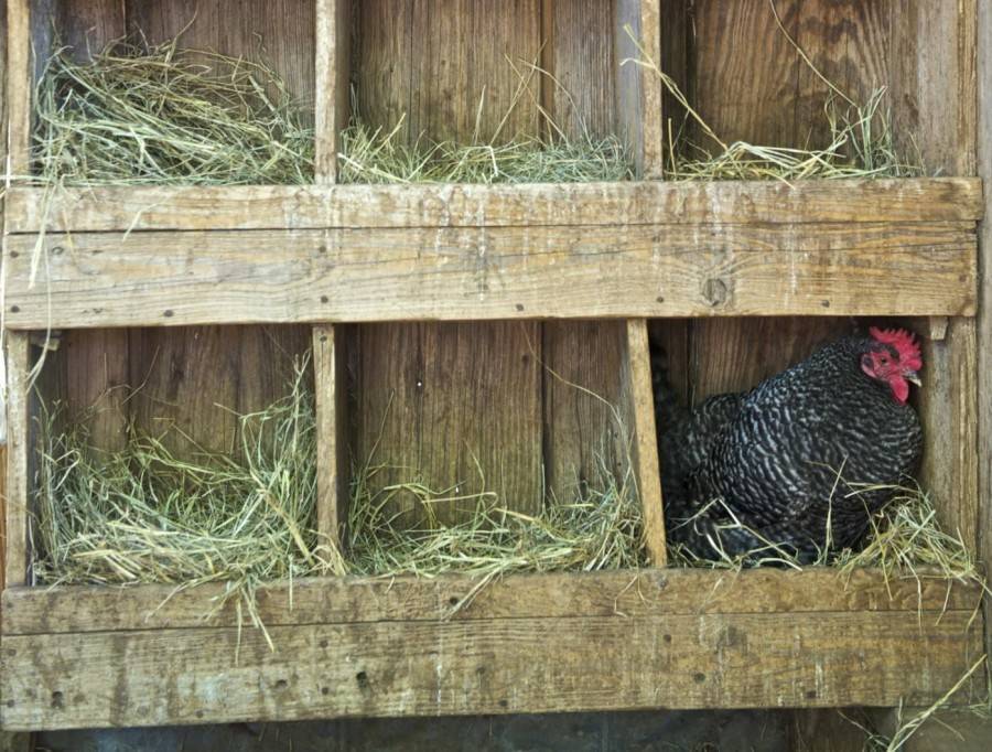 Если под курятник использовался сарай, внутри него для несушек обустраиваются гнезда. На 10 кур вполне достаточно установить 3 гнезда. Размер 1-го гнезда должен составлять 35х35 см.