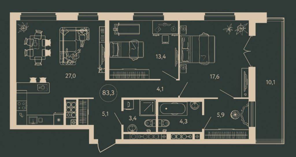 На сегодня стоимость двухкомнатной квартиры 83,8 кв. м с террасой 10,1 кв. м составляет 9 301 800 рублей. Отметим, что данный вариант от застройщика — это пространство с европланировкой (евровушка): помимо двух отдельных спален запроектирована просторная кухня-гостиная площадью 27 кв. м.