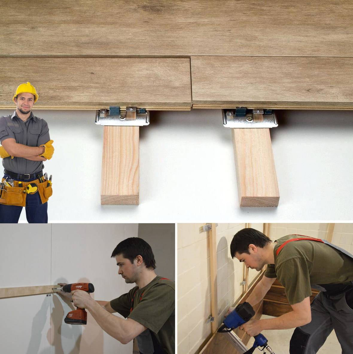 Среди самых распространенных вариантов крепления ламината на стены: каркасный и клеевой. В случае использования первого необходимо тщательно подготовить основание и выровнять стены стартовой штукатуркой. В данном случае неровности поверхности не должны быть больше 1-3 мм. Клеевой ламинат крепится к основе с помощью специального клея. Замковый ламинат монтируется на жидкие гвозди или на специальные крепежи. Последние также используются в монтаже МДФ-панелей.