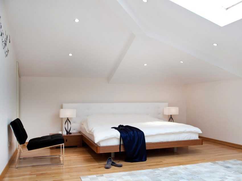 Продуманное сочетание темного ламината с белым интерьером спального помещения