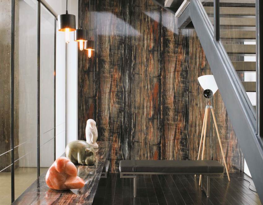 Для создания общей картины и контрастов серого ламинирующего покрытия, используются декоративные детали и предметы, необычная мебель с присутствием блестящего металла, необычный рельеф на стенах.