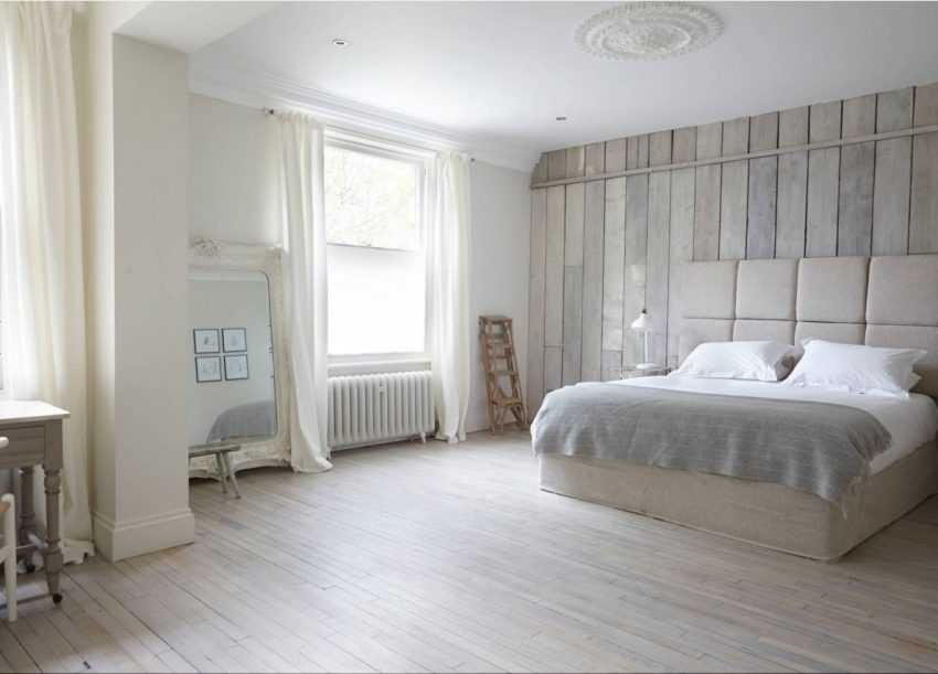 Выбеленный ламинат стоит сочетать с мебелью и текстилем цветов, которые на несколько тонов темнее пола. Если все поверхности будут одинаково белыми, спальня станет похожей на медицинскую палату.