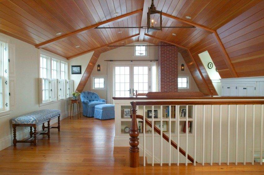 Оформление мансарды неплохо будет смотреться, если отрезать дополняющие полосы на треть общей длины, сверху и снизу положить гребенку, а среднюю часть занять основными панелями. В зависимости от цвета создают светлые либо темные поверхности