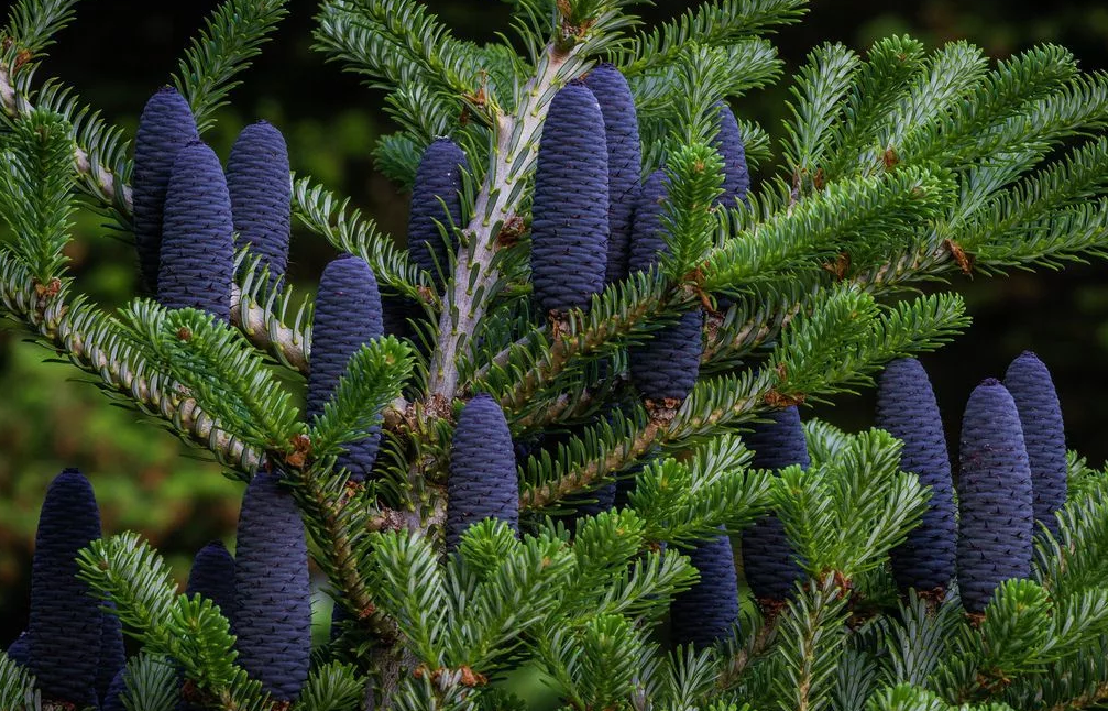 Пихта корейская, хвоя которой отливает серебром, а шишки необыкновенного фиолетового цвета;