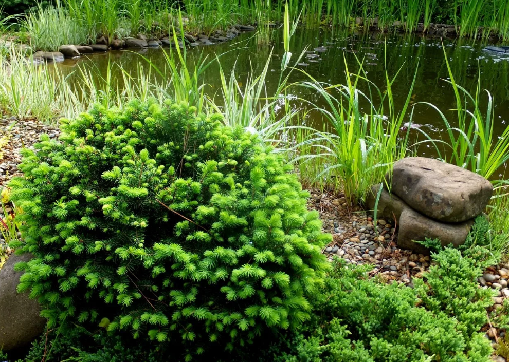 Низкорослые хвойные кустарники в сочетании с среднерослыми, способны создать непередаваемую атмосферу японского сада