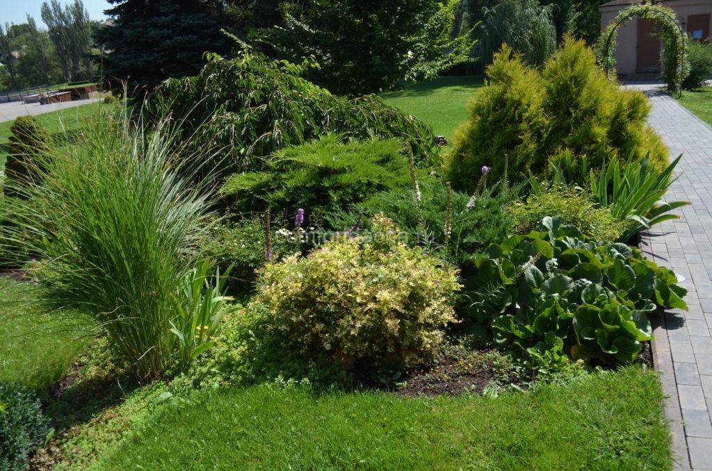 - для третьего и четвертого ряда подбирают декоративные хвойники и кустарники с пропорциональным уменьшением высоты – так, чтобы каждый ряд подчеркивал красоту предыдущих, не скрывая их