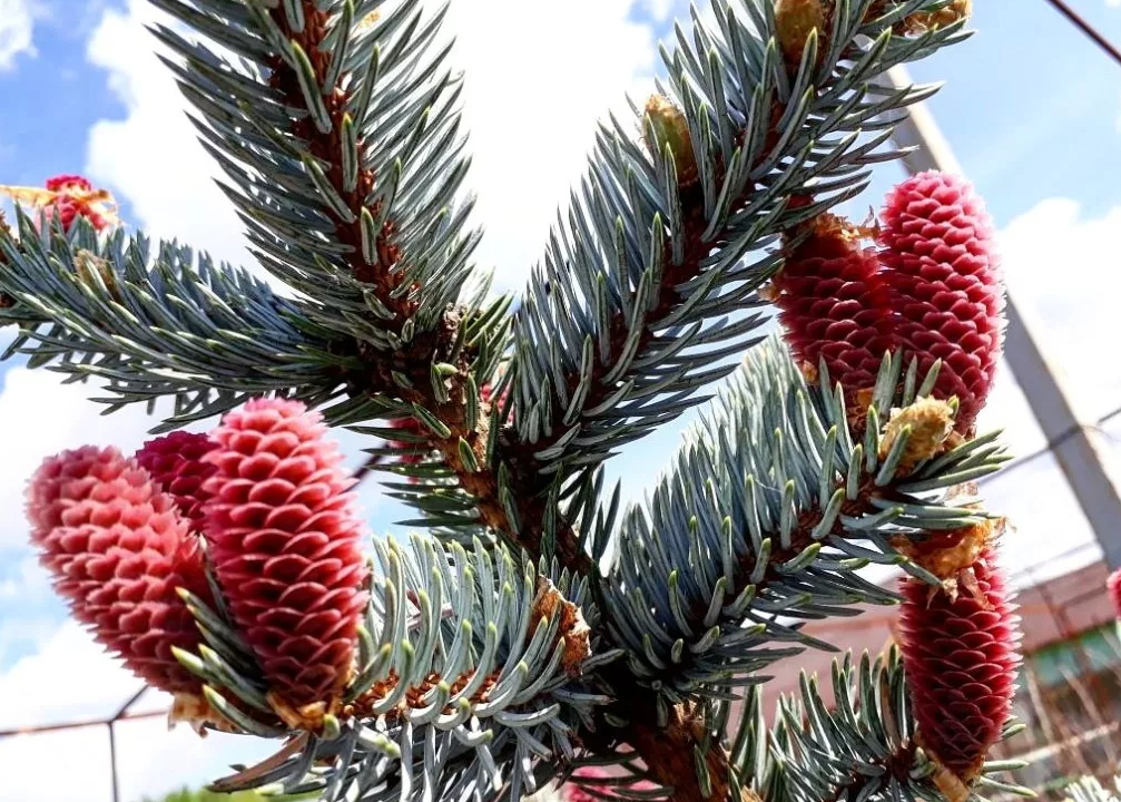 Взрослая растительная культура обрастает шишками, которые в молодые – обладают голубоватым оттенком, потом темнеют до бурого цвета.