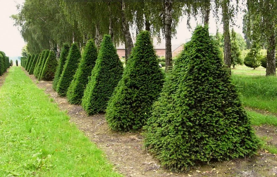В некоторых планировках длинное хвойное дерево может частично заменять ограду. Их можно размещать группами в линию.