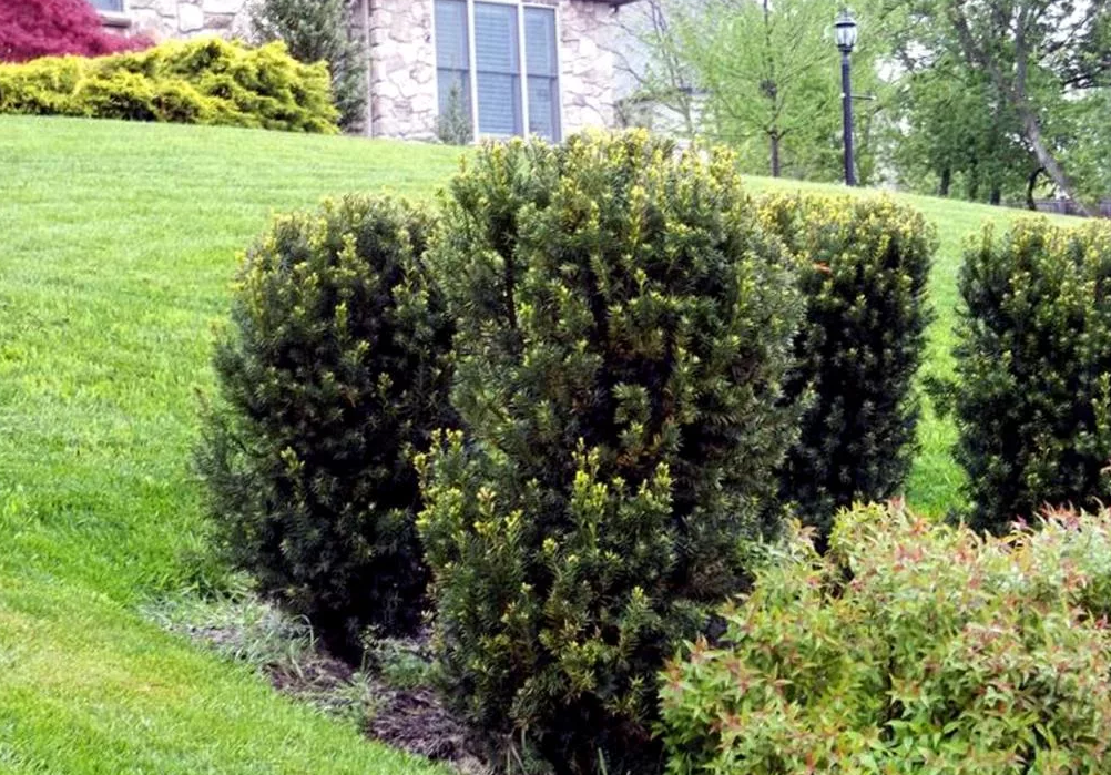 - ягодный тис — небольшой кустарник, имеющий пышную хвою. Он прекрасно растет на газонах, популярен в силу своего контраста насыщенных красных ягодок с сочной зеленью;