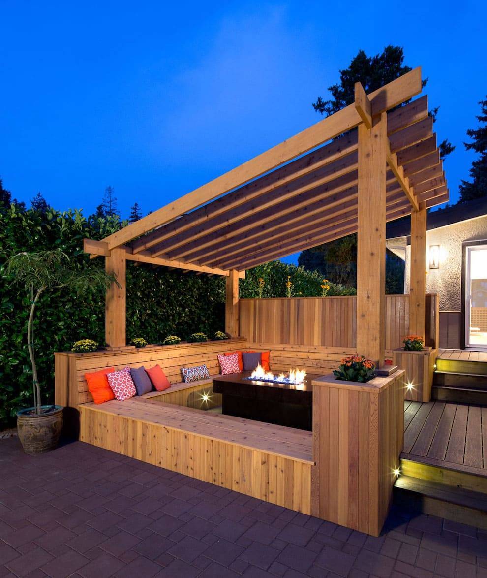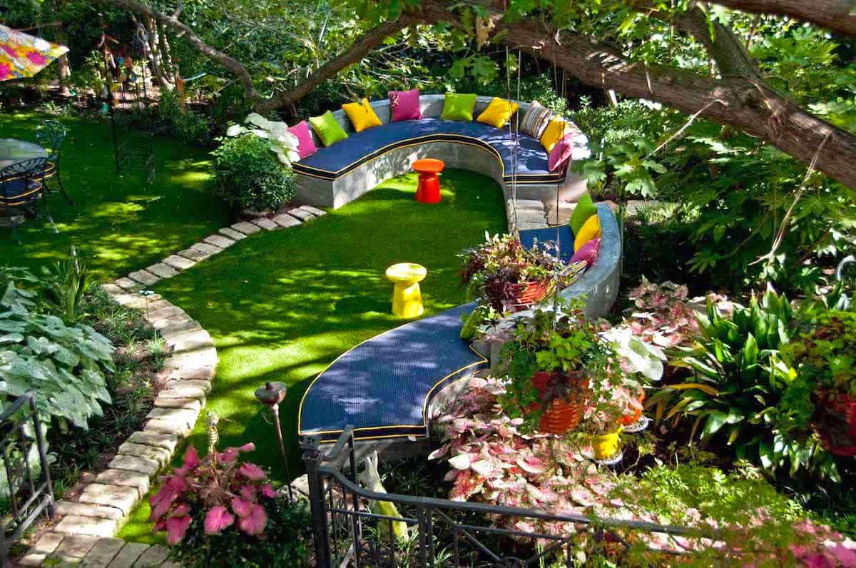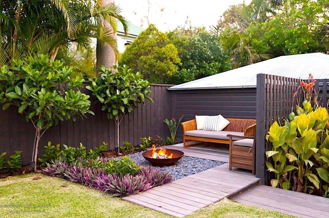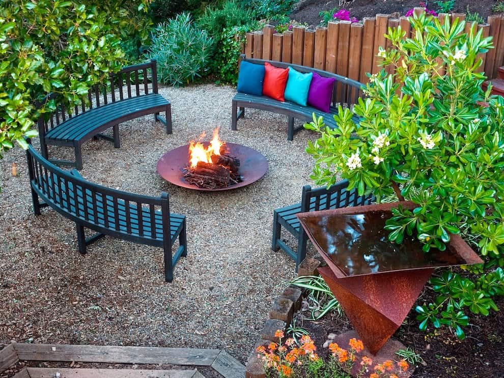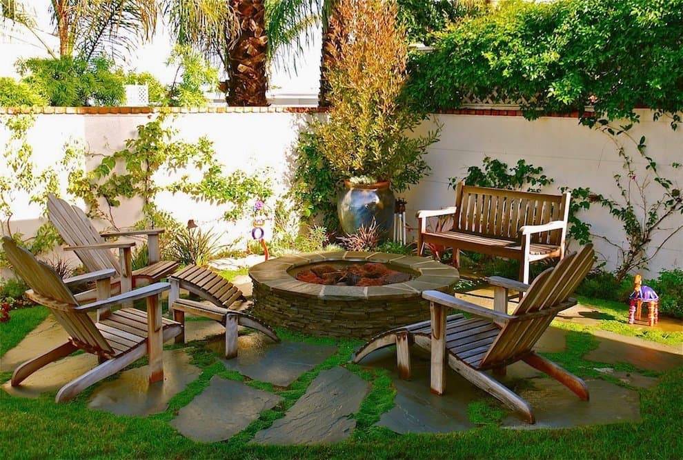 Отличным координационным центром станет очаг круглой формы: вокруг него можно расположить мебель, сформировать тропинки и посадить растения. Если дворик закрытый и узкий, рекомендуется сконструировать угловую скамью: она гармонично вольётся в дизайн, а круглый очаг сгладит строгие линии.