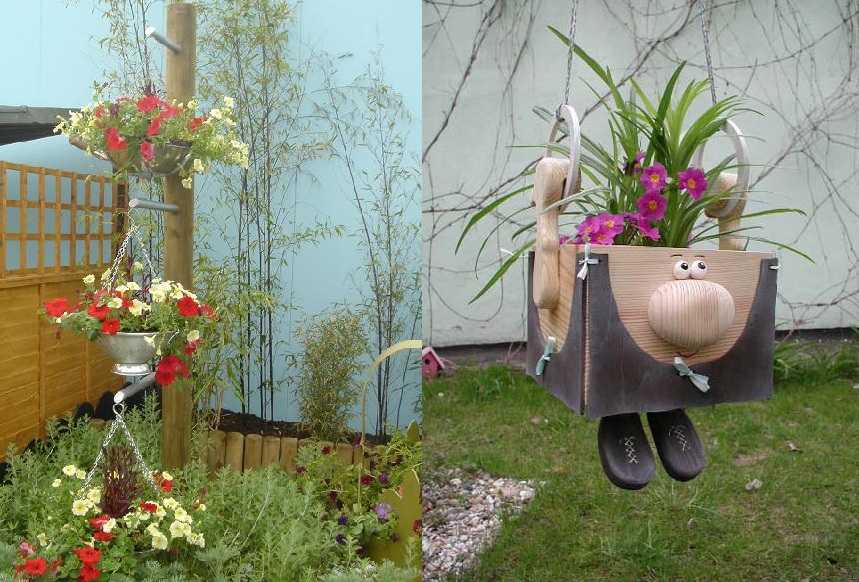 Украшение участка состоит часто из мелочей. Например, обычный деревянный ящик легко превращается в украшение сада — интересная окраска и нестандартная установка — повесить на веревках, которые оформить как руки. Столб используется как основа для подвески горшков с ампельными цветами.