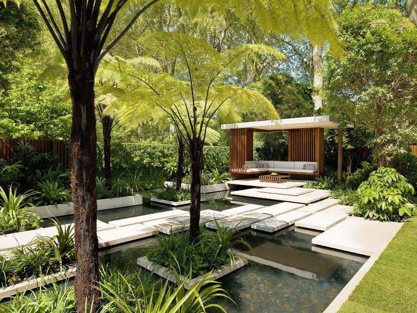 Важно: на небольшом участке особое внимание уделяют размерам архитектурных элементов и высоте растений. Большой бассейн или раскидистые деревья ограничат свободное пространство. Поэтому стоит подумать о проектировании малых архитектурных форм и растительных композиций
