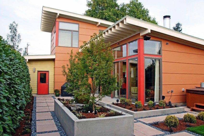 Современный дом частного дома должен обязательно включать свою планировку элементы геометрии. Это могут быть правильно расставленные элементы дизайна, игра и геометрическими фигурами и расположение дорожек.