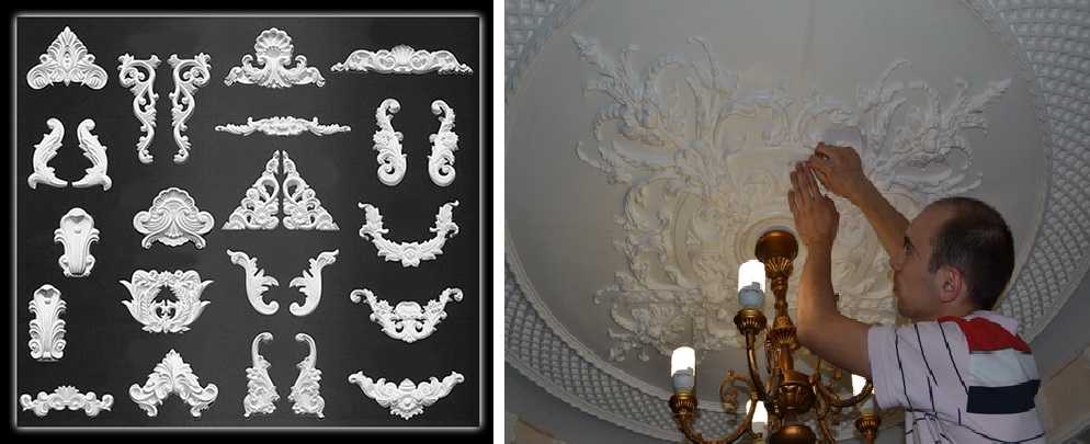 Всё это можно красить в любой цвет и легко монтировать на клей. Этот материал тоже устойчив к влажности и температурным перепадам. Единственный нюанс – такие украшения неэластичны и не скрывают дефекты стены и потолка. И, наконец, они легко ломаются при малейшем усилии, так что размещение такого декора в местах, где он может подвергнуться механическому воздействию, недопустимо.
