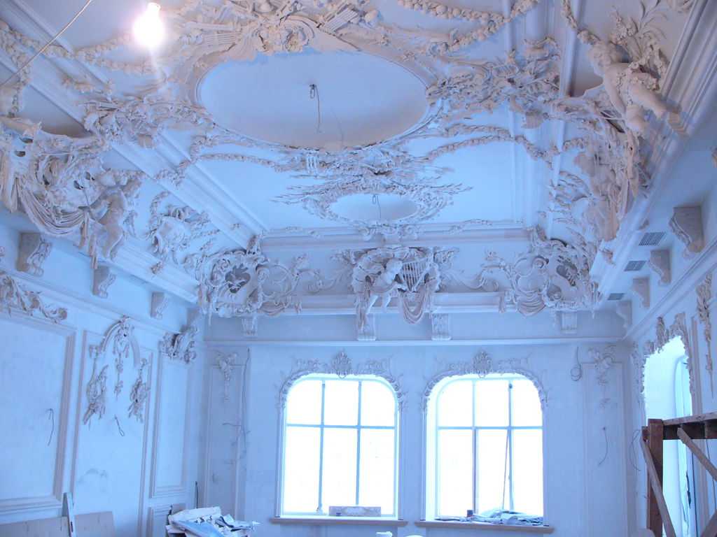 Барокко. Этому стилю присуща помпезность и торжественность. Лепнина представлена в чередовании с обилием скульптур, колон и зеркал. Характерный орнамент представлен плодами и цветами.