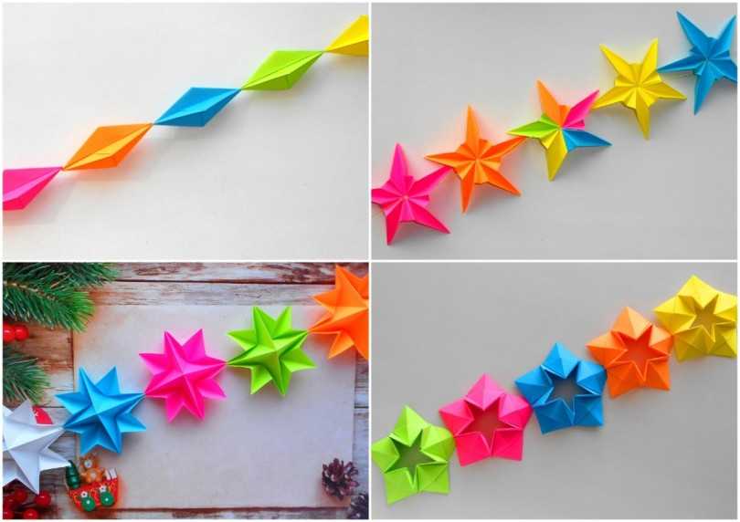 Представляем первую идею изготовления гирлянды на Новый год своими руками — из снежинок. Наверное, все мы помним, как вырезать плоскую снежинку из квадратного листа бумаги. Этот способ выручит вас, если требуется сделать гирлянду в максимально сжатые сроки. Однако если вы хотите сделать более изящное украшение, то предлагаем собрать его из объемных снежинок. Делаются они несколько дольше и сложнее, зато получившаяся гирлянда переживет не один праздник.