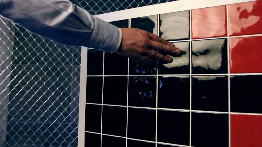 - При помощи дрели аккуратно высверливаем отверстия. Их необходимо делать в 2 этапа: сначала просверливаем насквозь отверстие для тела самореза, а потом его немного рассверливаем под больший диаметр – чтобы спрятать головку шурупа. Замачиваем керамику на 7-10 минут в воде. Затем наносим на нее клеевую смесь, распределяя ее при помощи гребешка и склеиваем с основанием. Тщательно удаляем остатки клея с торцов – они должны быть чистыми.