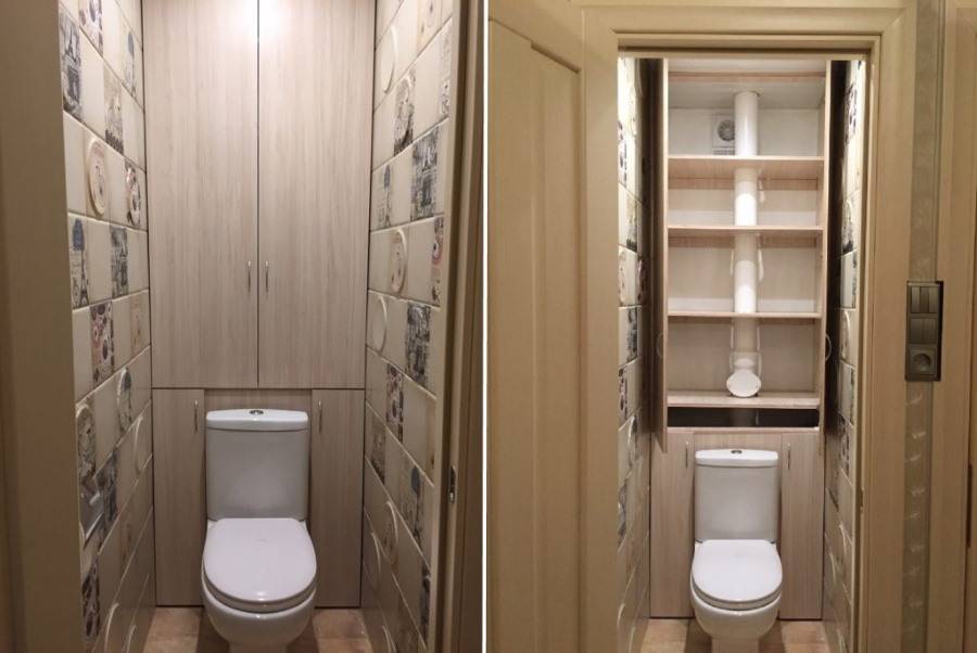 первым делом нужно определиться с габаритами и видом дверок, сделав эскиз изделий. От удаленности унитаза от коммуникаций зависит размер шкафа – если прибор расположен вплотную к трубам, то конструкцию стоит оборудовать над сливным баком, но с учетом того, что створки не должны задевать его;