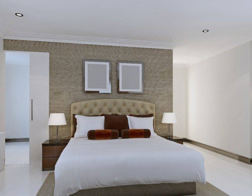- Два спота в области изголовья кровати будет недостаточно. Дело в том, что точечные светильники с холодным светом раздражают зрительную функцию. Специалисты рекомендуют использовать дополнительно прикроватные бра или торшеры;