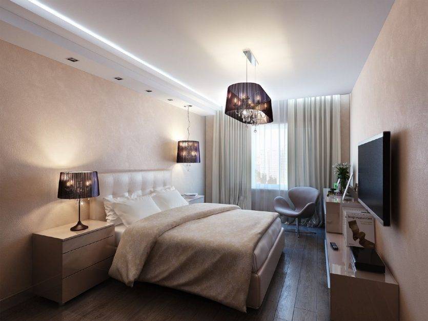 Поэтому при создании дизайн-проекта спальни, в первую очередь, внимание уделяется обустройству нескольких групп освещения потолка, работающих отдельно и зависящих от формы и площади помещения