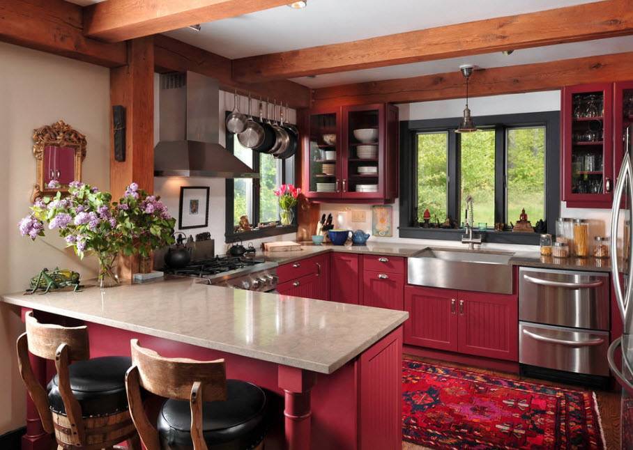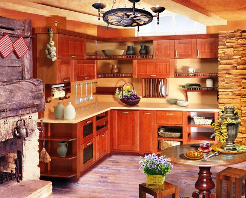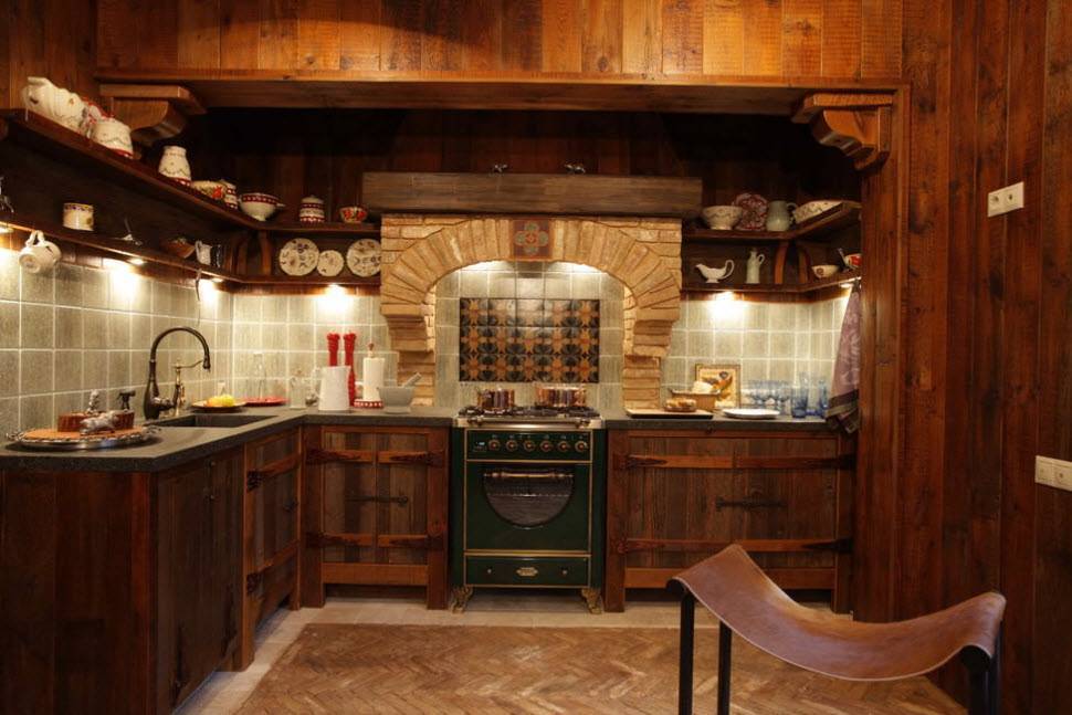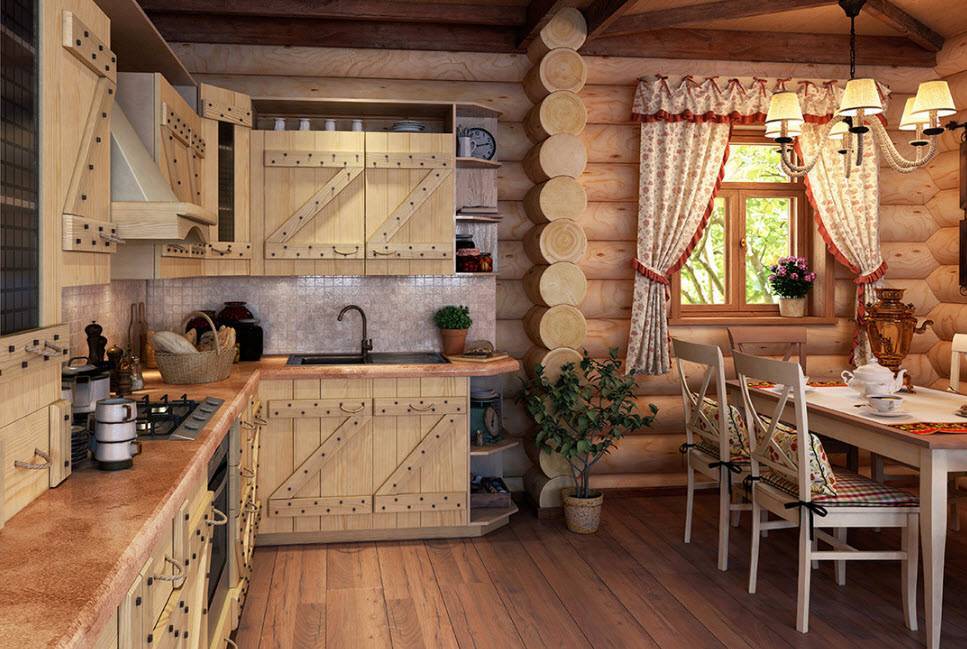 Выбор дизайна кухни начинается с оценки помещения, где будет размещено все необходимое для приготовления пищи и, собственно, с качества дома. Шикарные интерьеры с хромированными плитами, холодильниками, шириной в 2 метра или тяжелой дубовой мебелью мало подходят для садового домика из щитов «а ля рус» периода 60-х годов прошлого столетия. Трудно современный интерьер «втиснуть» в небольшое помещение у печки, которое отводится в бревенчатых домах старых русских построек.