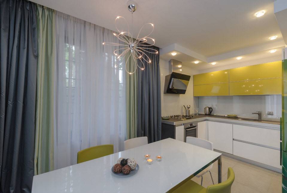 Если потолок невозможно выполнить идеально гладким и ровным из-за значительных повреждений или неровностей, используют натяжные конструкции. Подбирают тонкую пленку и конструкции, которые незначительно убавляют общий объем кухни.