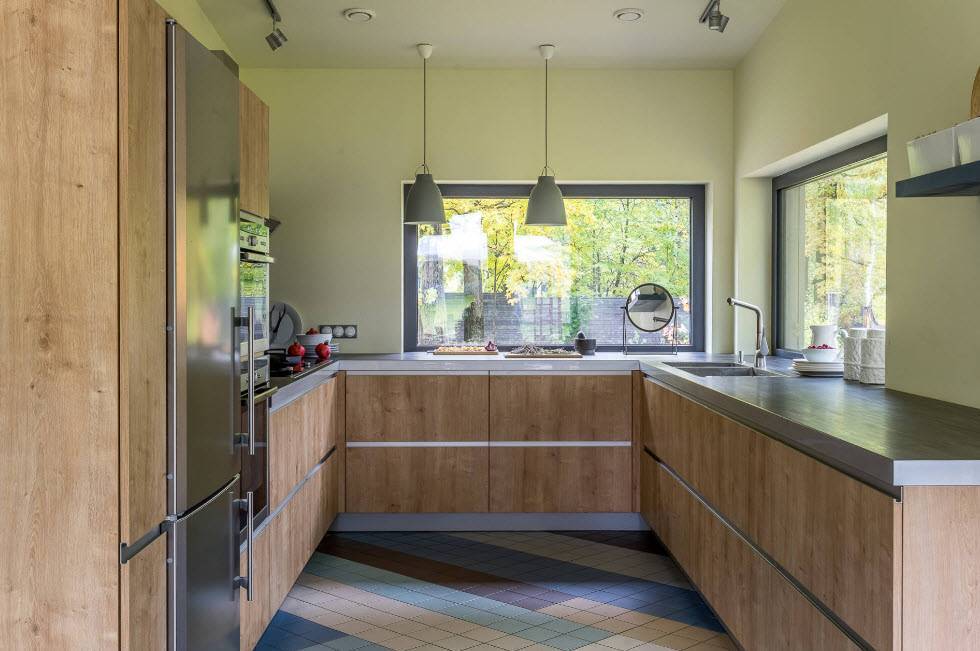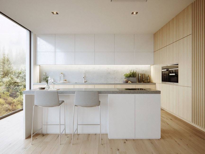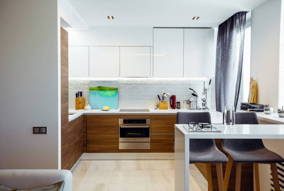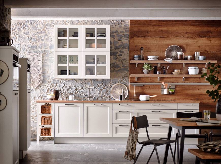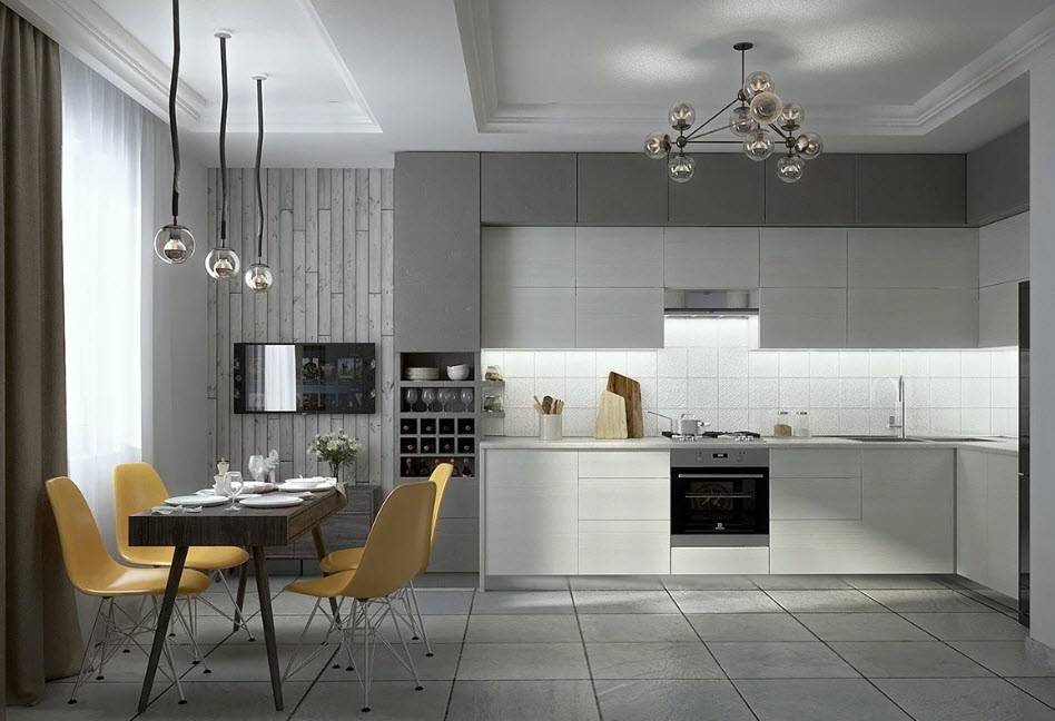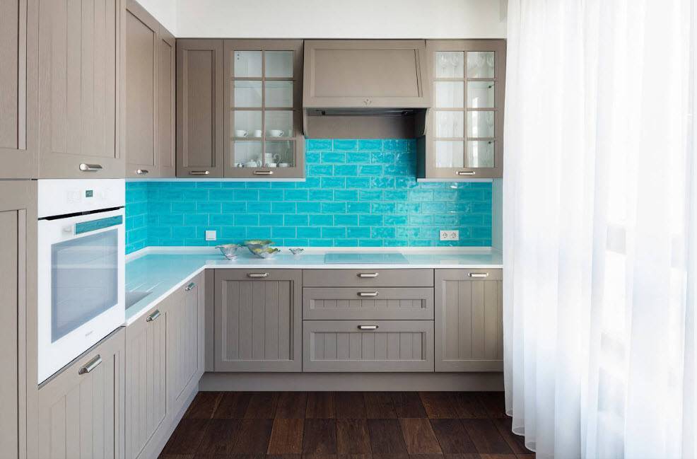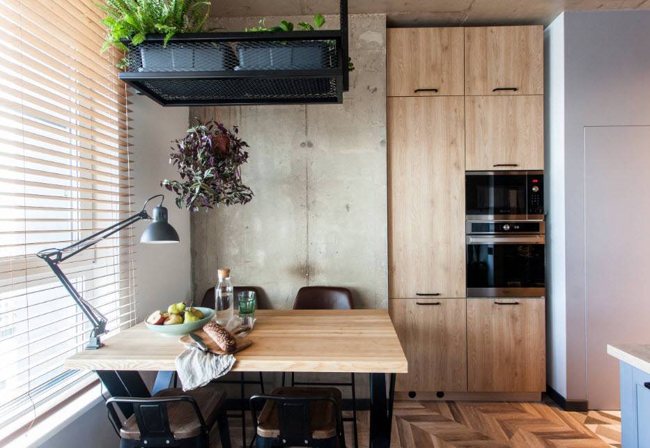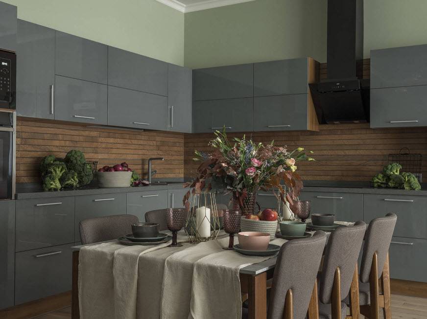 - Гармоничное сочетание отделочных материалов с другими цветами в интерьере кухни.